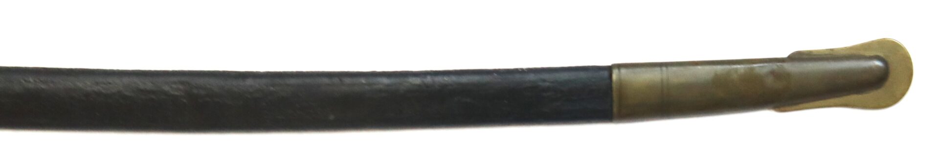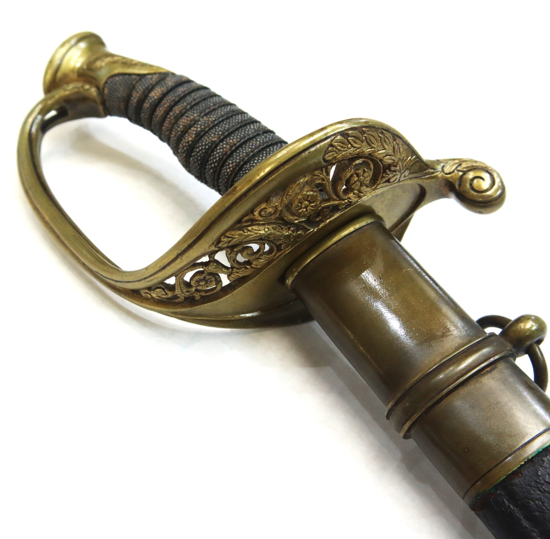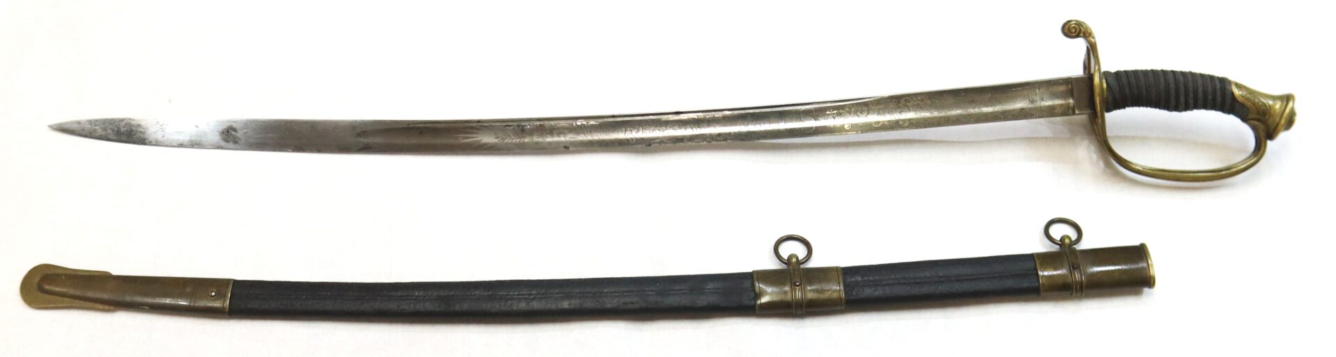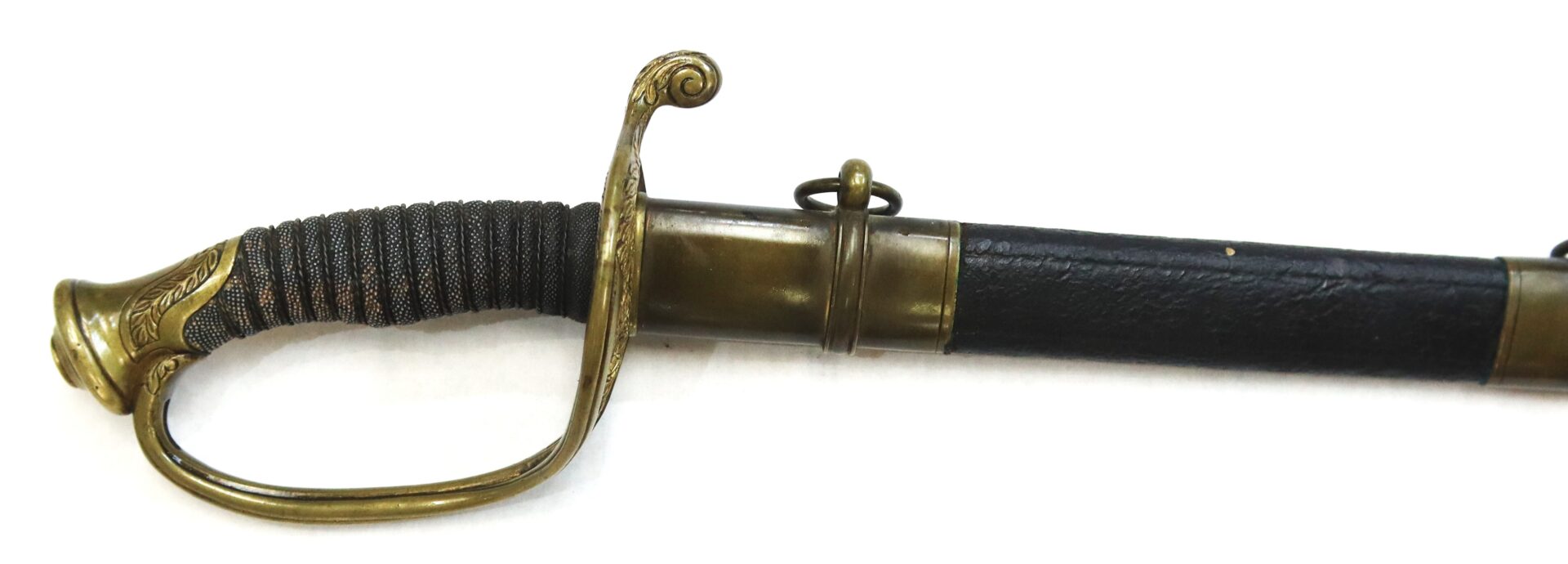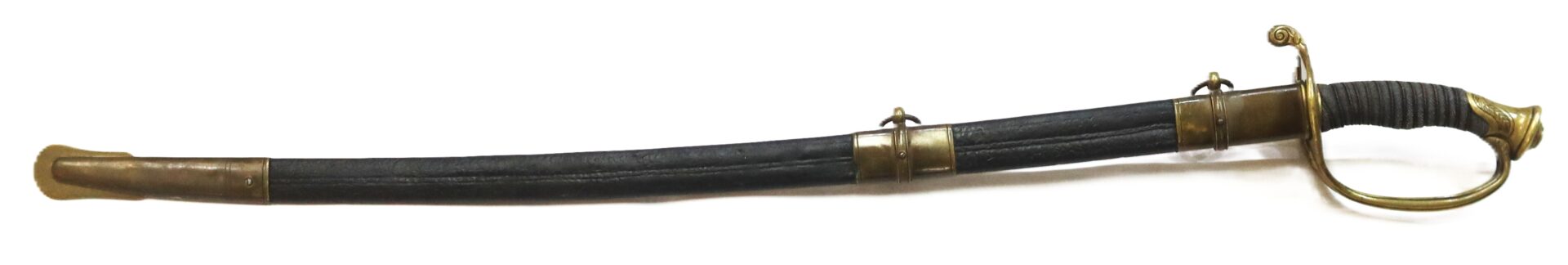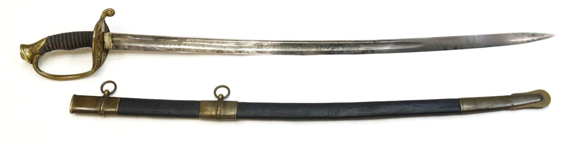 The sword is accompanied by its leather scabbard with brass throat, mounts, and dual suspension rings. The leather body shows age and natural curvature but remains solid and complete — a desirable survival, as many officer swords have lost their original scabbards or they suffer from age and poor handling, this is a solid and well-preserved example.