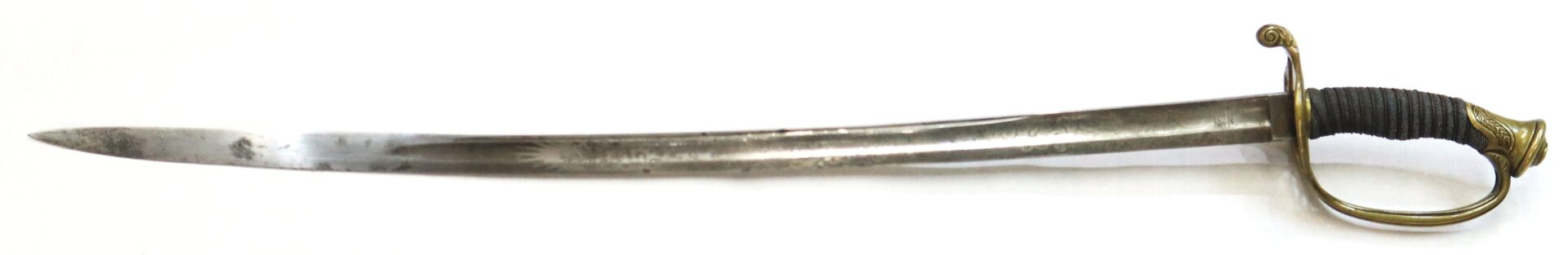 The hilt features the elegant brass half-basket guard characteristic of the Model 1850 pattern, displaying a rich, untouched mustard patina. The leather grip remains intact with original twisted wire wrap present and secure.