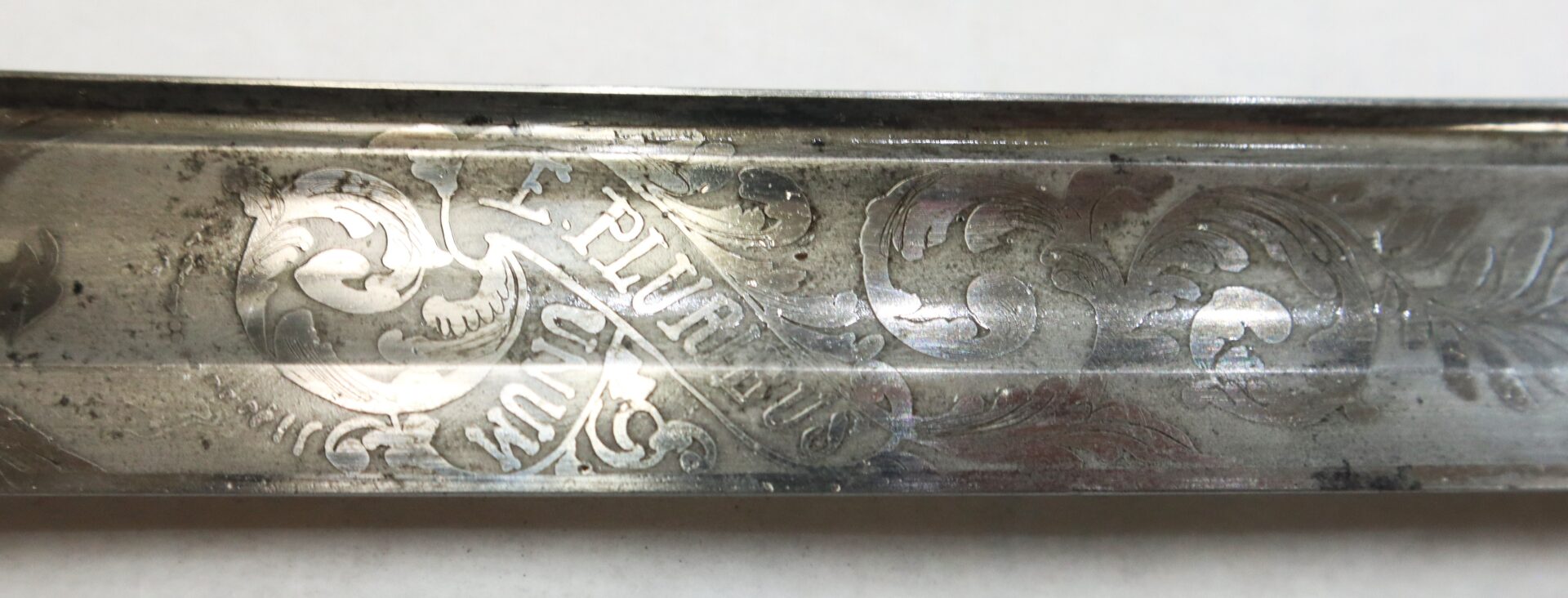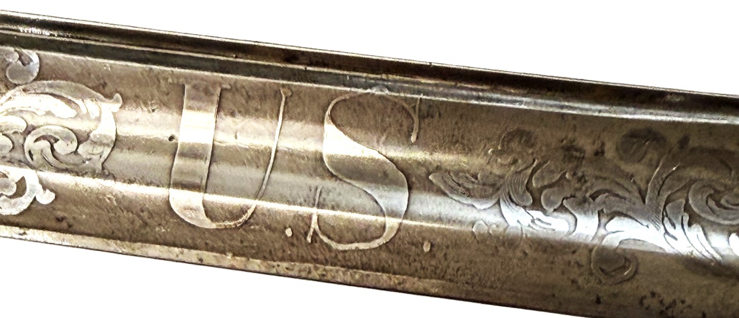 The blade retains strong original etching, including a bold “U.S.” panel, spread-wing Federal eagle, and classic martial trophy motifs. The etched panels remain clearly visible against a pleasing, lightly aged steel surface showing honest freckling and natural patina consistent with period use.