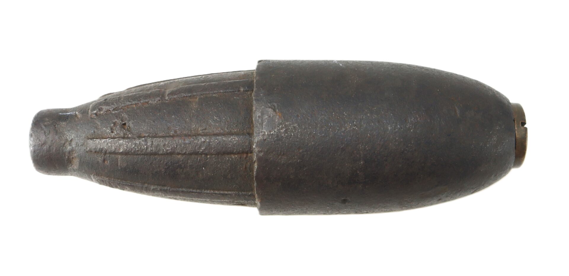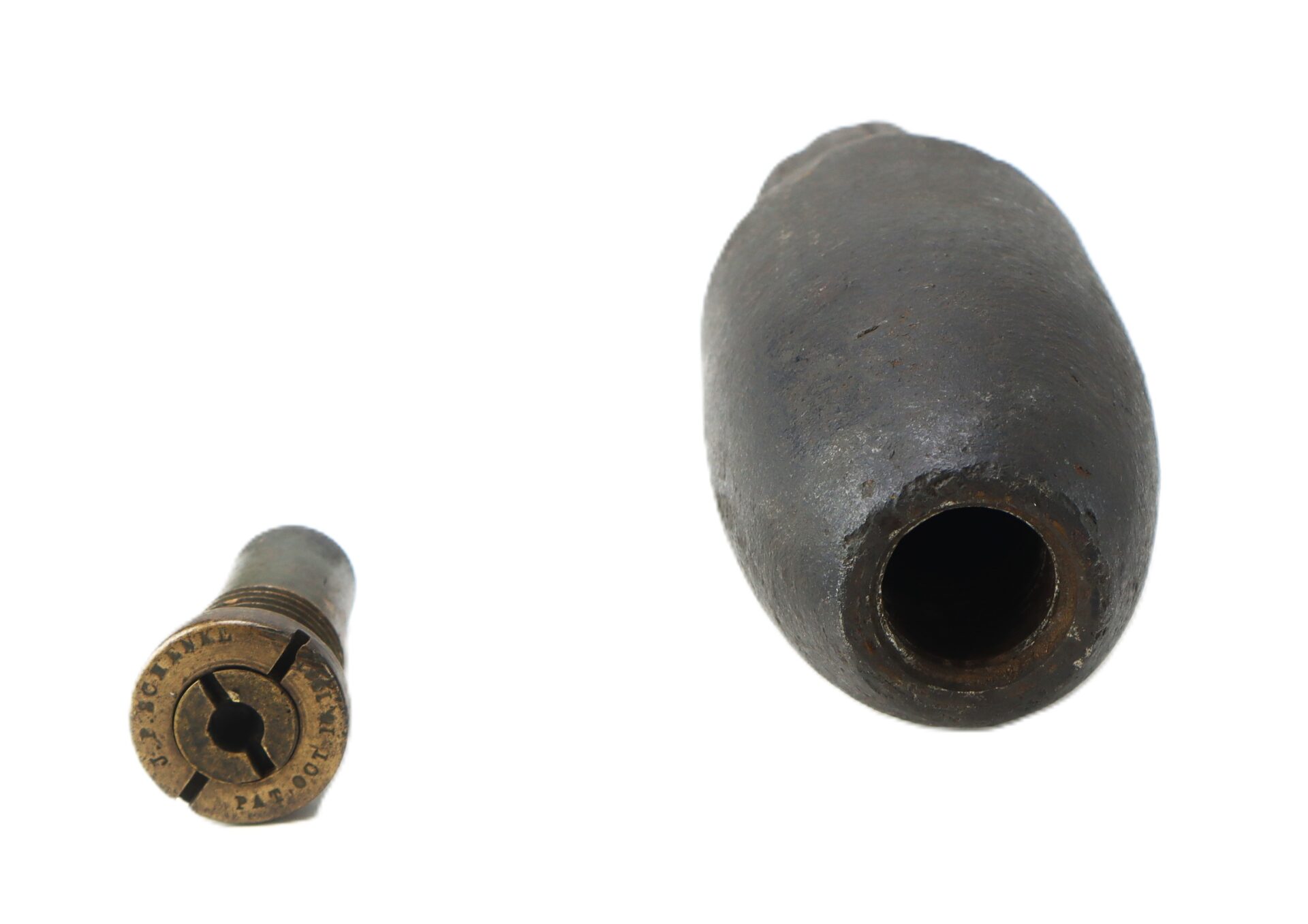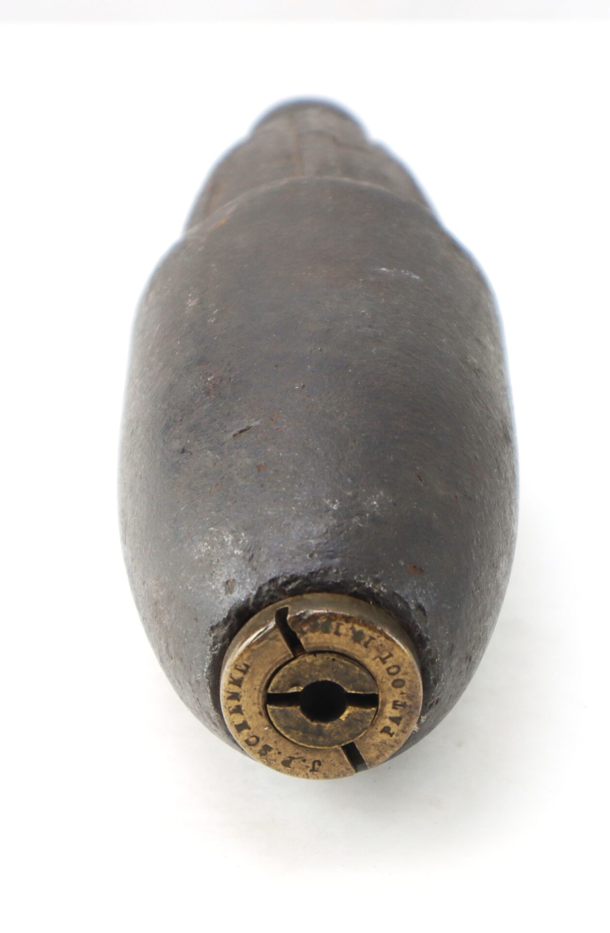 This was the most common Schenkl pattern purchased by the Federals. Approx. 9-inches long. It employed a papier-mache sabot (which is not present). The original brass percussion fuse is clearly stamped “J.P. SCHENKL PAT. OCT. 16, 1861.” The fuse screw threads are in excellent condition ad unscrews from the shell easily. This example was once part of the Jack Bell collection and was recovered in Gettysburg.
