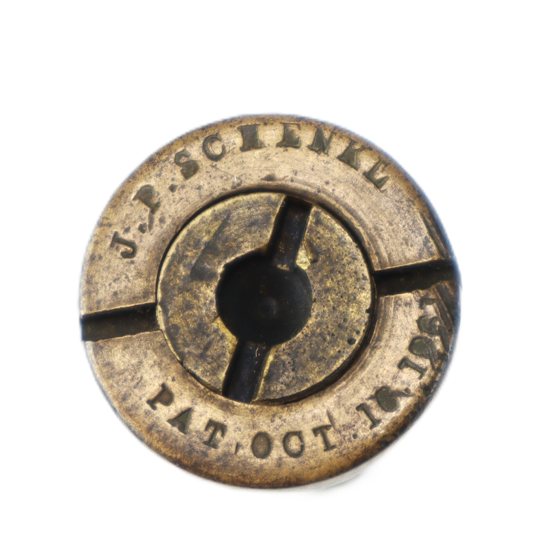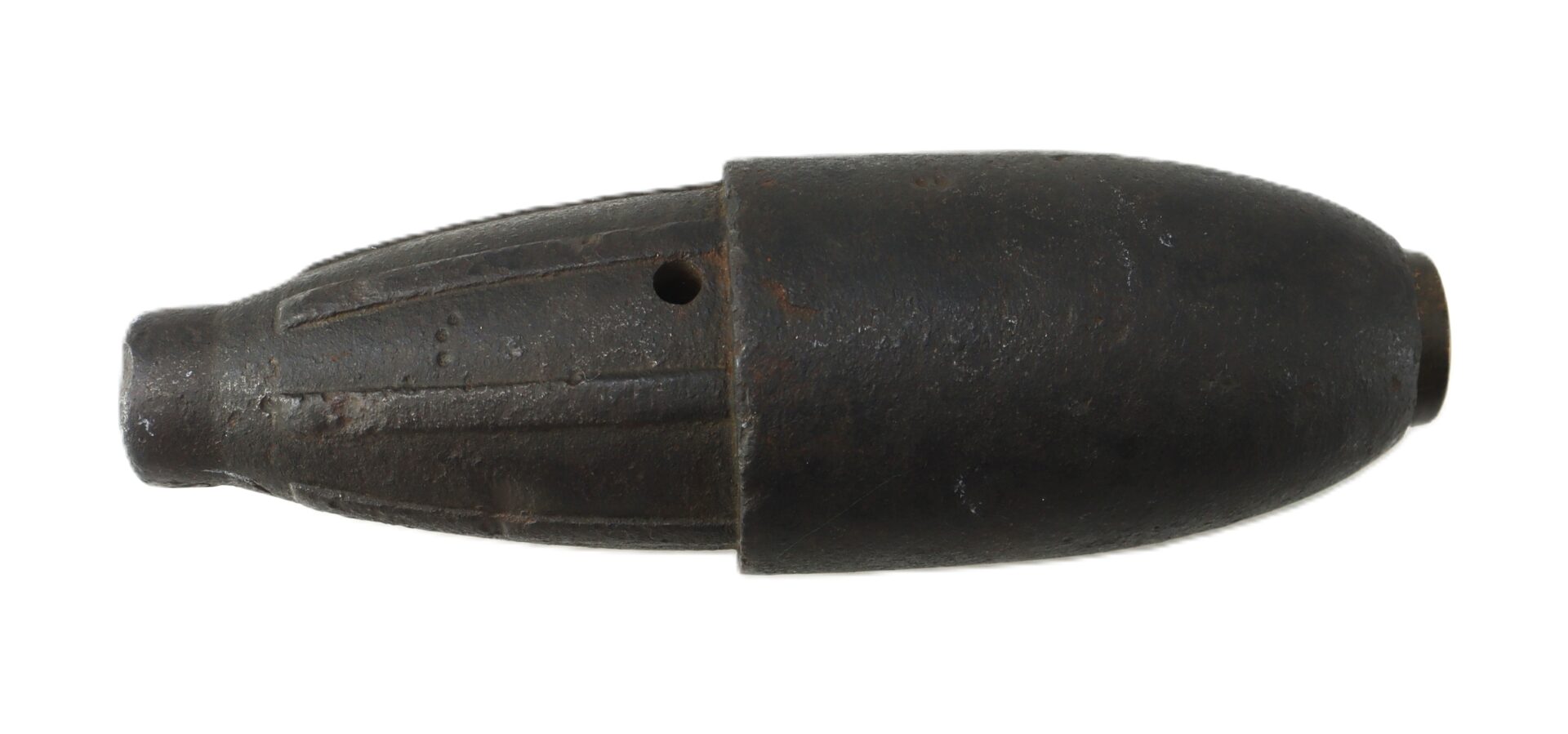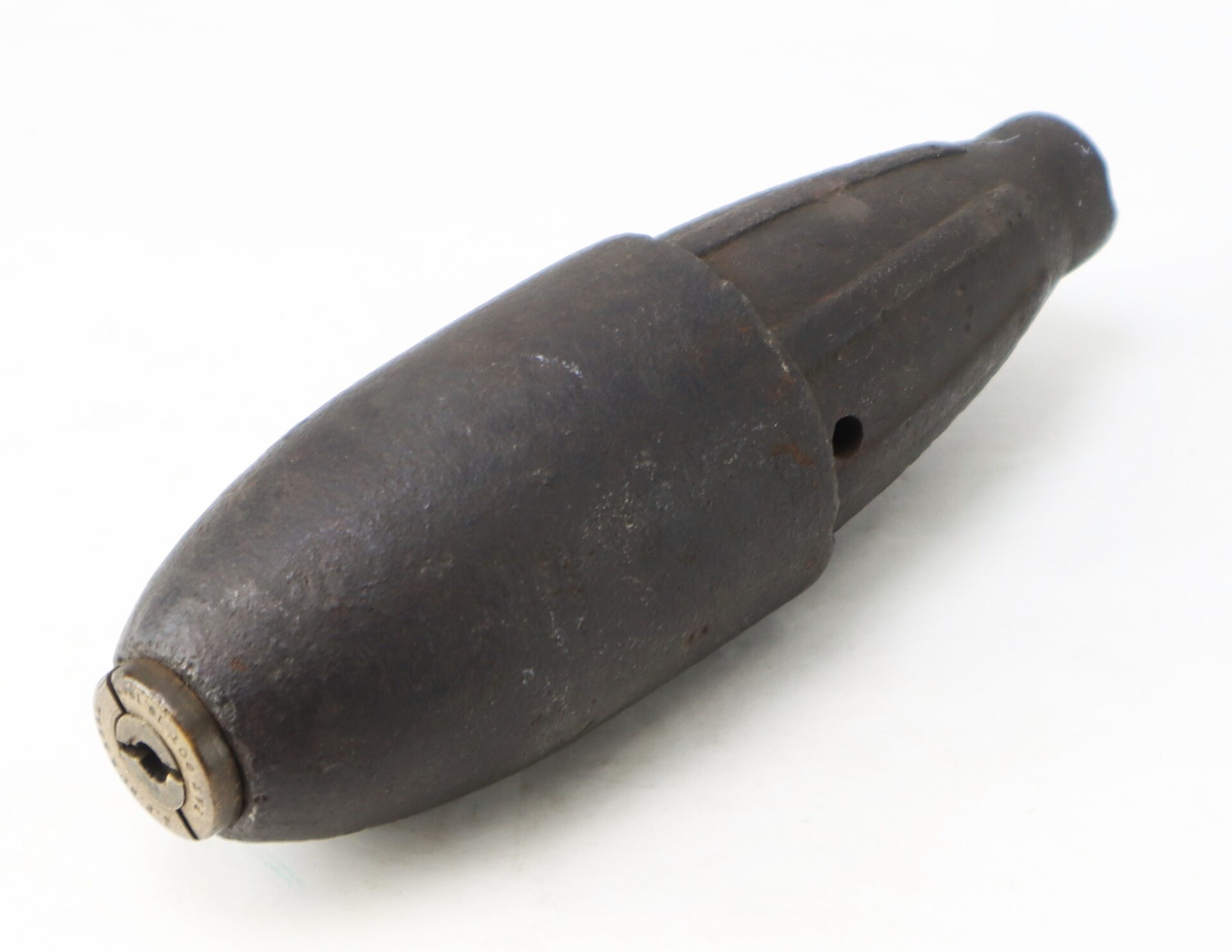 This was the most common Schenkl pattern purchased by the Federals. Approx. 9-inches long. It employed a papier-mache sabot (which is not present). The original brass percussion fuse is clearly stamped “J.P. SCHENKL PAT. OCT. 16, 1861.” The fuse screw threads are in excellent condition ad unscrews from the shell easily. This example was once part of the Jack Bell collection and was recovered in Gettysburg.