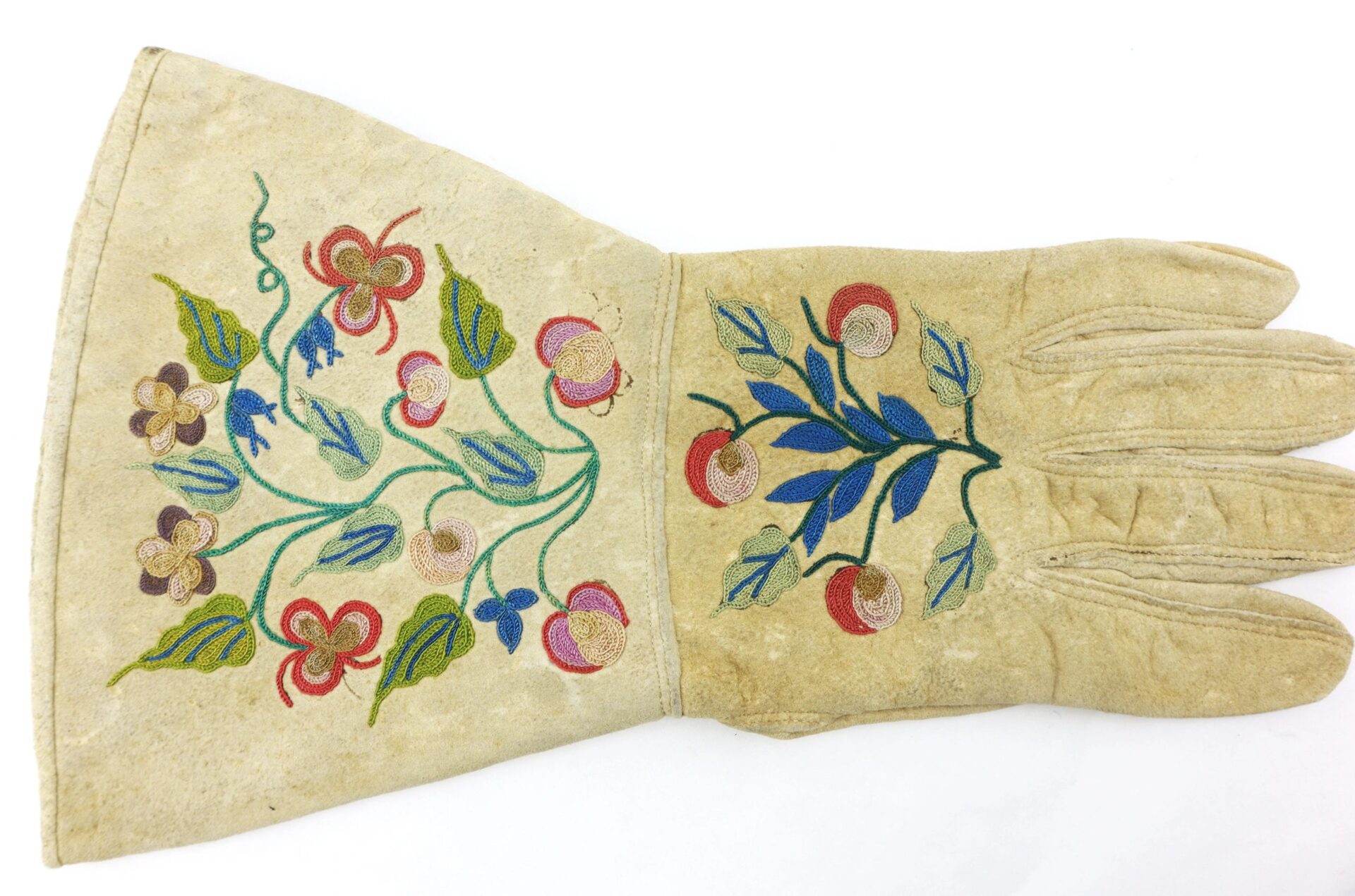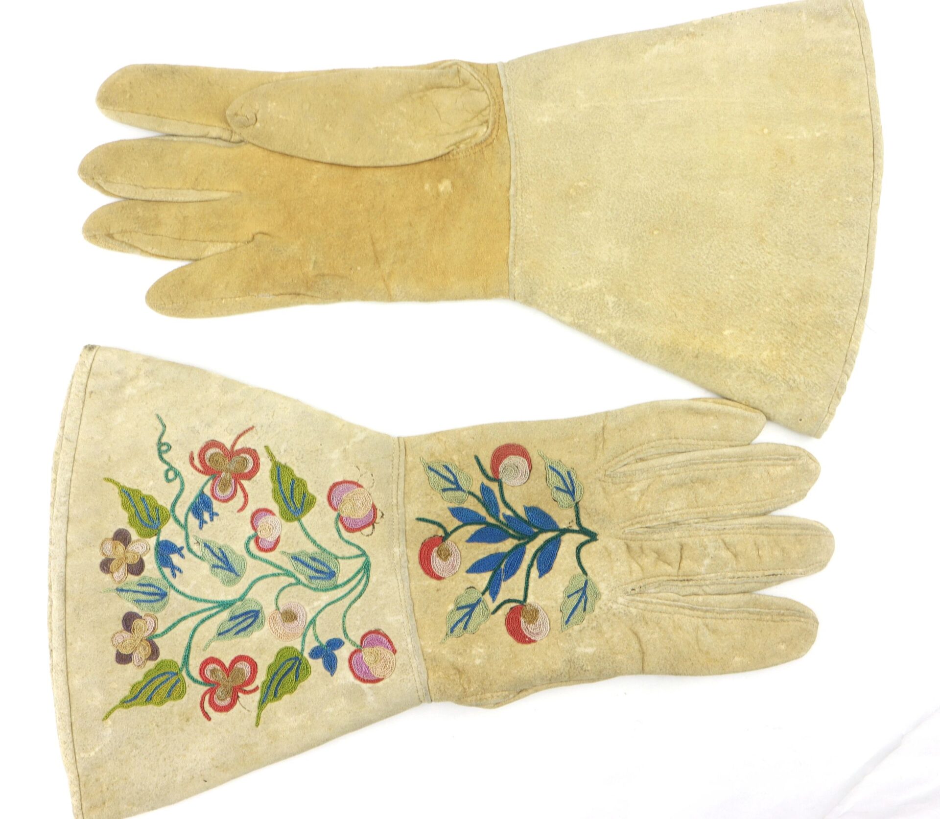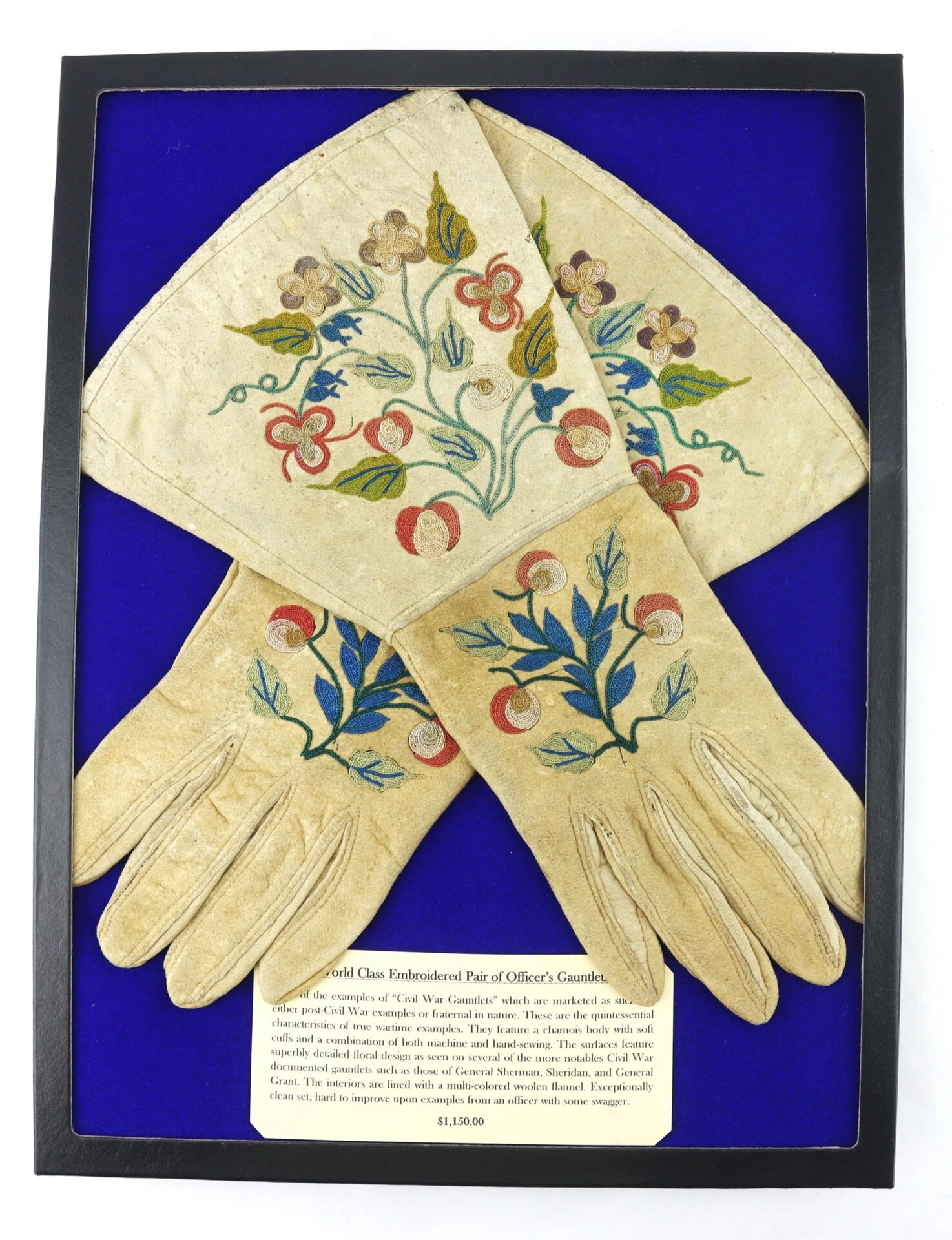 World Class Embroidered Pair of Officer’s Gauntlets – Inventory Number: UNI 163 / SOLD Most of the examples of “Civil War Gauntlets” which are marketed as such are either post-Civil War examples or fraternal in nature. These are the quintessential characteristics of true wartime examples. They feature a chamois body with soft cuffs and a combination of both machine and hand-sewing. The surfaces feature superbly detailed floral design as seen on several of the more notables Civil War documented gauntlets such as those of General Sherman, Sheridan, and General Grant. The interiors are lined with a multi-colored woolen flannel. Exceptionally clean set, hard to improve upon examples from an officer with some swagger.  Comes housed in 12 x 16 riker display case with blue velvet and descriptive card.   Inventory Number: UNI 163 / SOLD