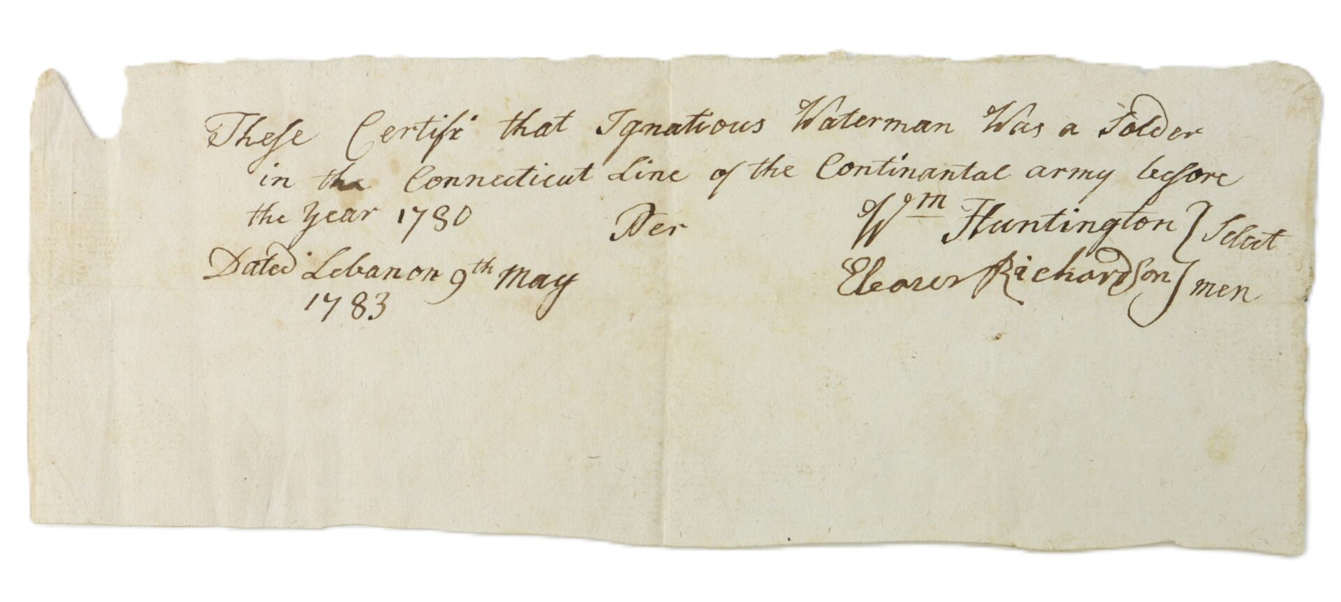 Revolutionary War Soldier’s Certification Ignatious Waterman – 9th Connecticut Line / SOLD