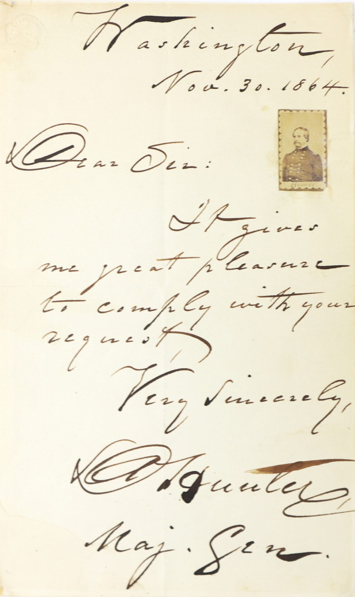 Autograph Letter Signed — Maj. Gen. David Hunter Washington, November 30, 1864 / SOLD