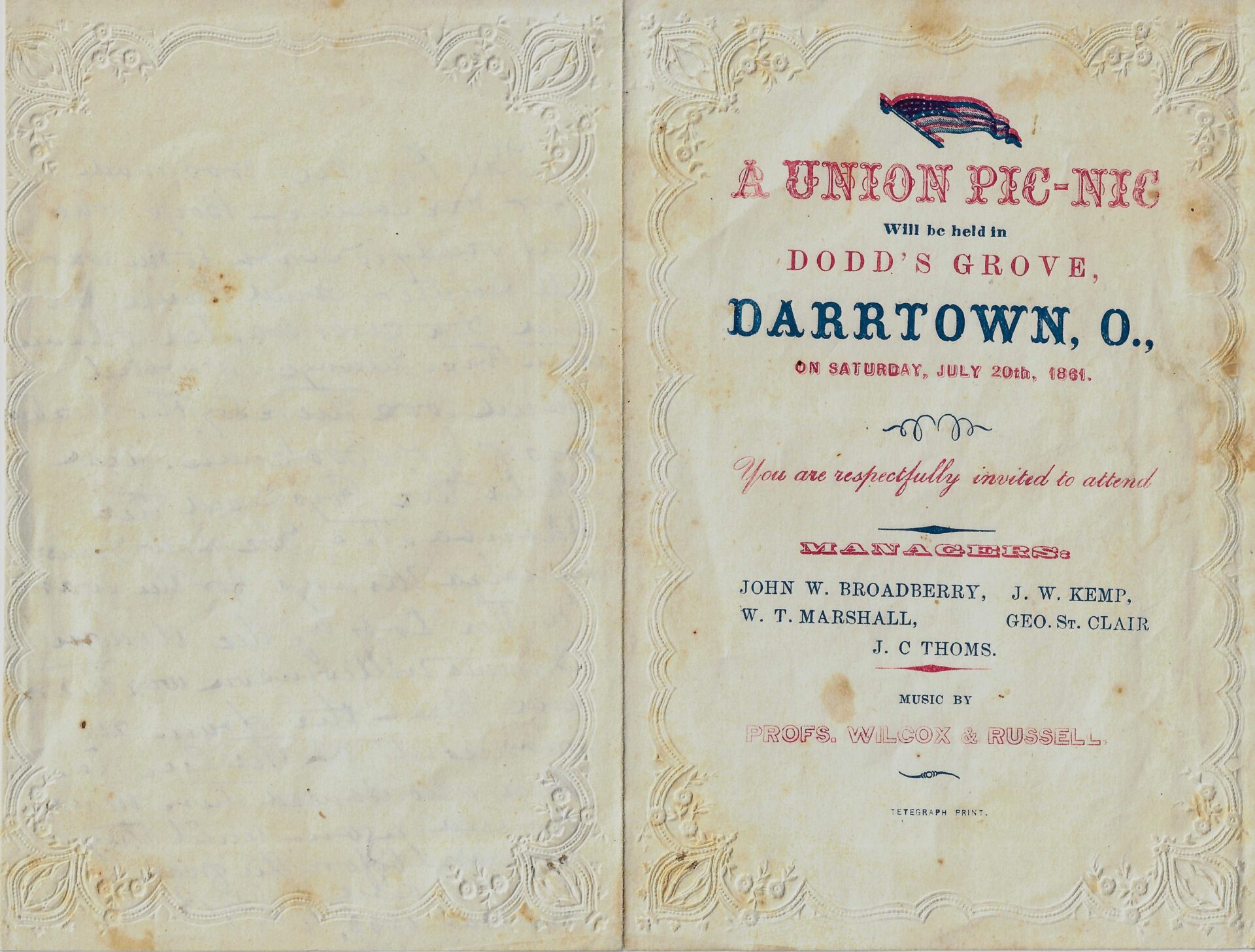 Civil War-Era Patriotic Invitation with Post-War Remembrance A UNION PIC-NIC DARRTOWN, OHIO SATURDAY, JULY 20TH, 1861 The Day Before Bull Run! / SOLD