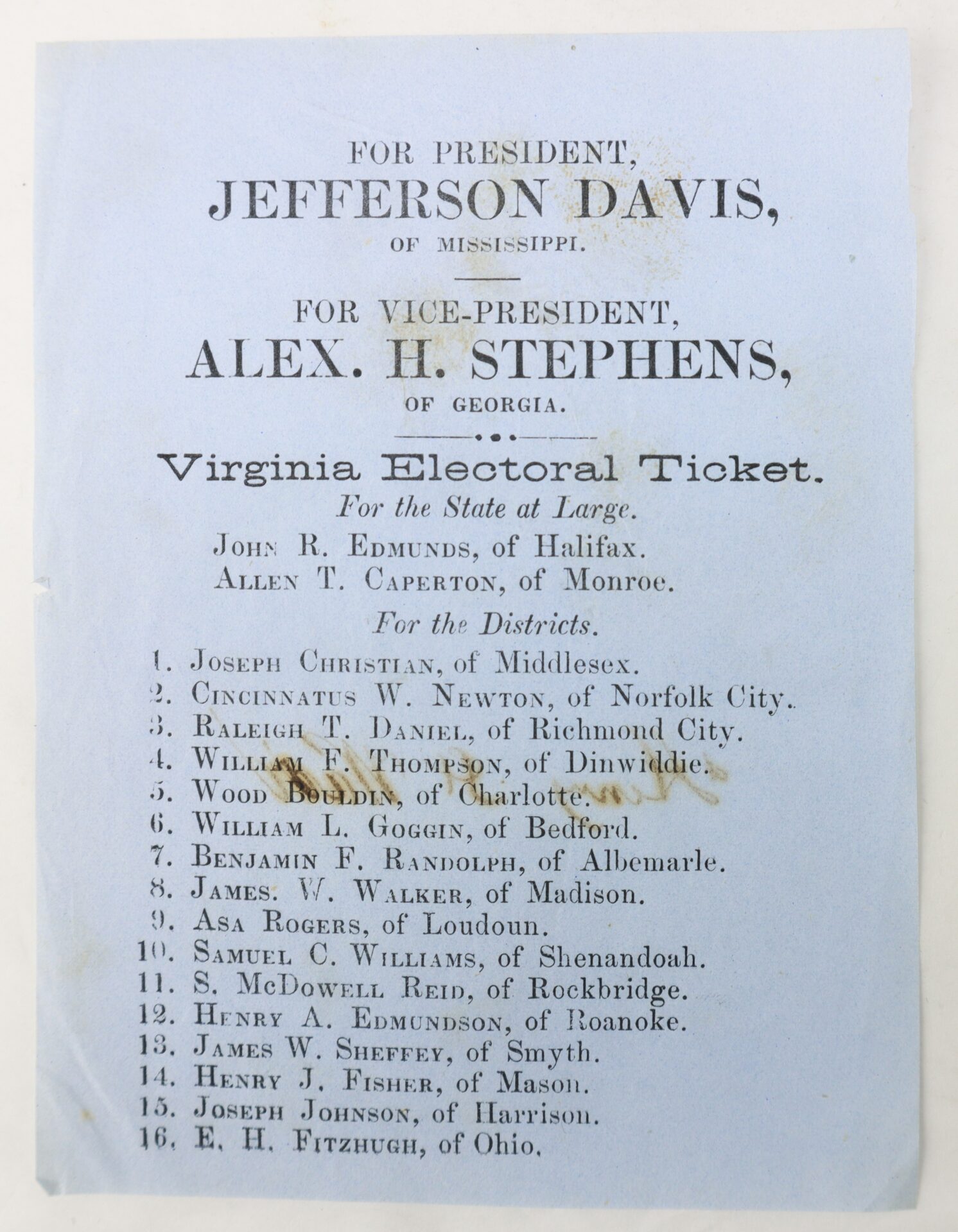 Confederate Jefferson Davis Presidential Electoral Ticket Virginia – 1861 / SOLD