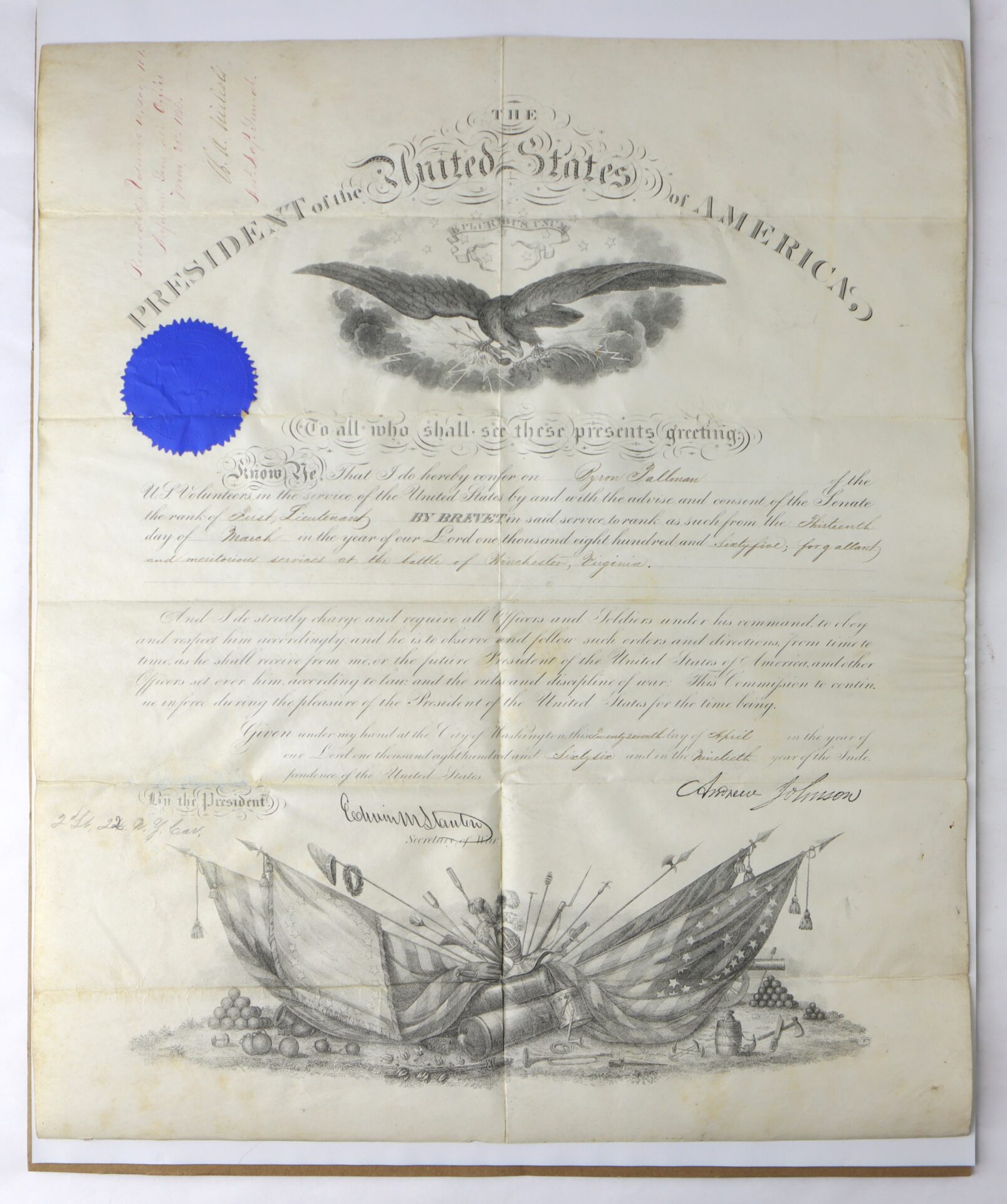 United States Presidential Commission Byron Tallman of the 22nd New York Cavalry Meritorious Service at the Battle of Winchester Said to have Captured Harry Gillmore